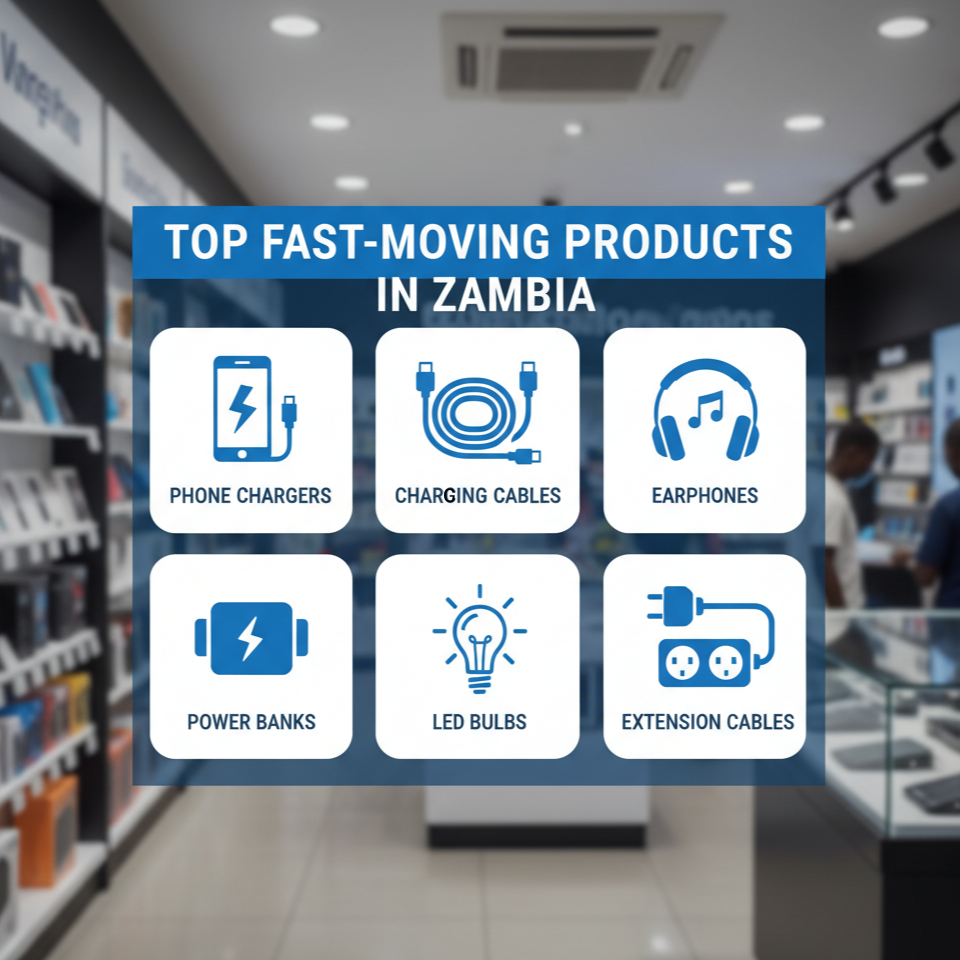 Phone chargers are one of the fastest-moving accessories in Zambia. Phones are used daily and chargers frequently get damaged or lost. Demand is constant across students, office workers and commuters.